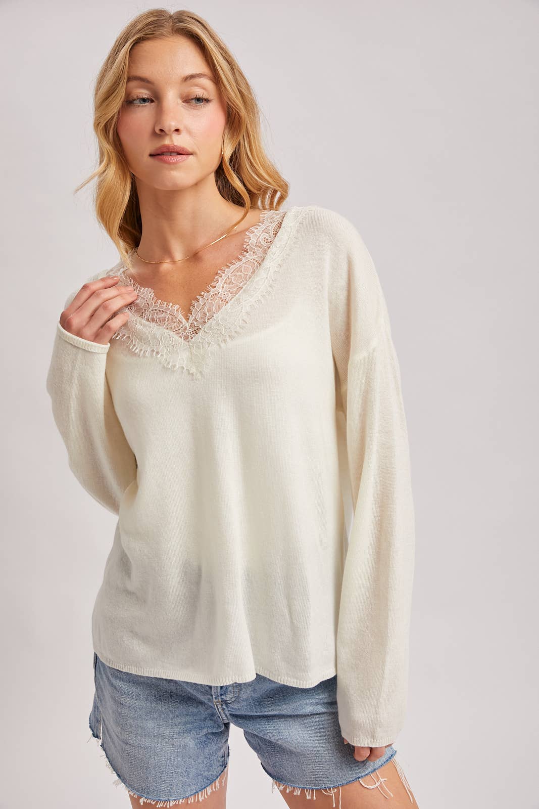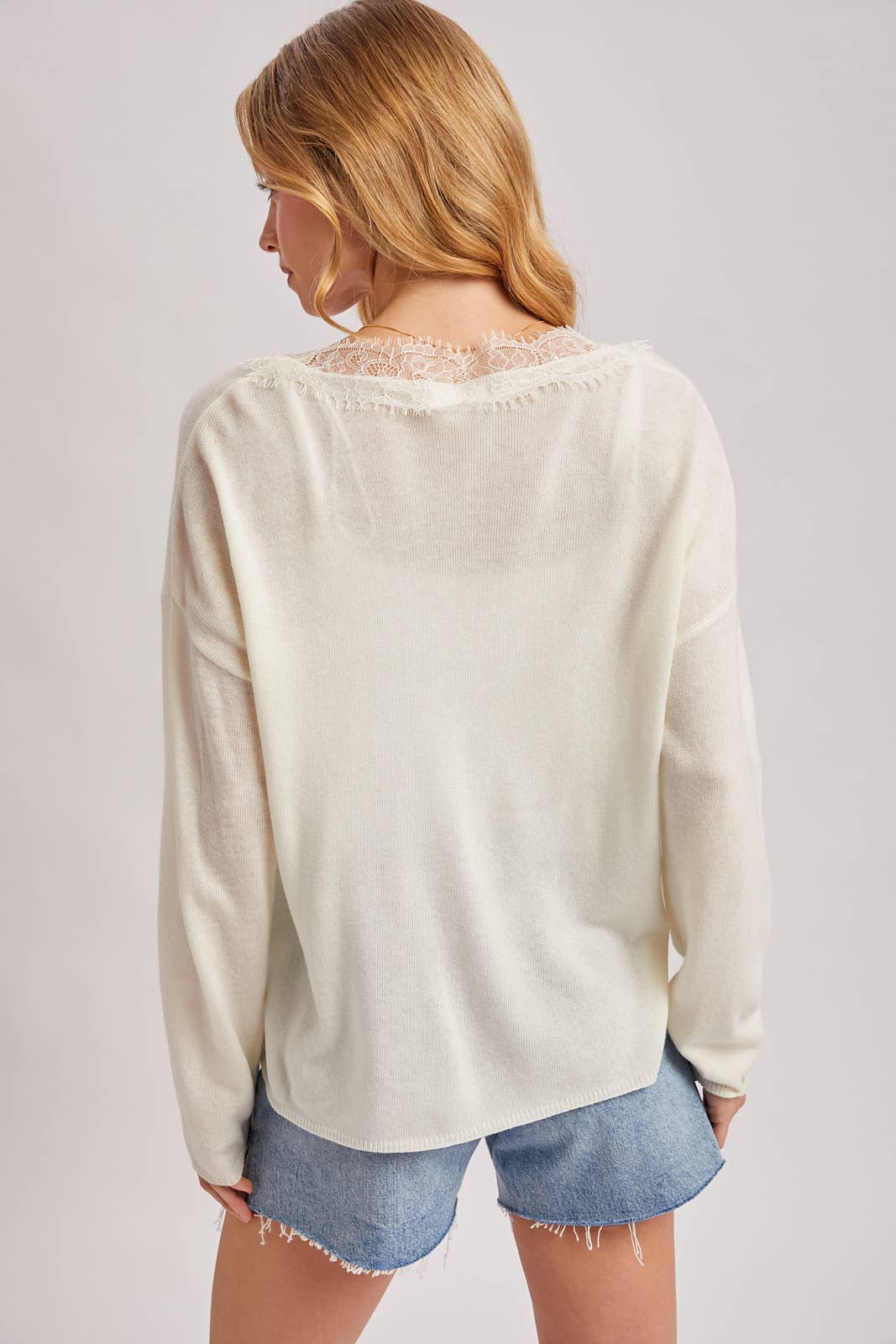 This top features a romantic and airy aesthetic, perfect for effortless layering. Crafted from a lightweight, fine-gauge knit with a soft, slightly semi-sheer texture, it offers a relaxed silhouette with a comfortable fit. The design is highlighted by a deep V-neckline, which is beautifully framed with an intricate eyelash lace trim for a delicate, feminine touch. With its dropped shoulders and long, loose sleeves, this versatile piece balances minimalist sophistication with romantic detailing, making it an ideal choice for an elevated everyday look.